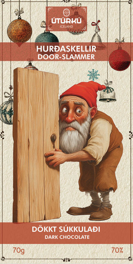 Door-Slammer (Hurðaskellir) is the seventh of the Icelandic Yule lads. He comes down from the mountains on the night of December 18th. He sneaks into houses after dark and waits until everyone is sound asleep. Then he goes from room to room banging doors loudly, laughing at the chaos he causes. He is not malicious - more like an overgrown prankster with endless energy. In old Icelandic farmhouses, where families slept close together in shared rooms, his noisy antics would have been especially irritating!