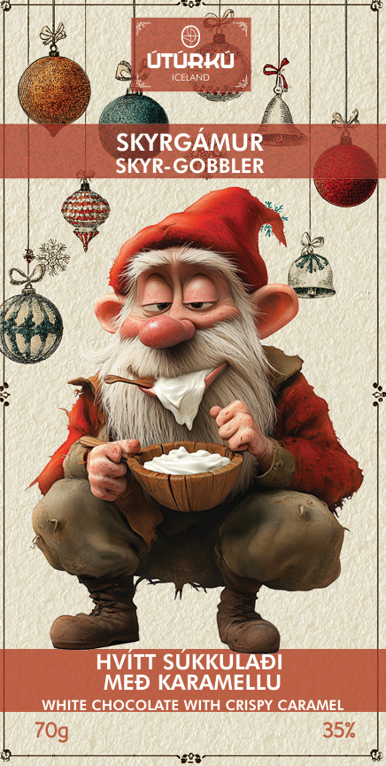 Skyr-Gobbler (Skyrgámur) is the eighth of the Icelandic Yule lads. He comes down from the mountains on the night of December 19th. He sneaks into farms and cottages to steal skyr from the pantry, cellar or wherever it is stored. In old Icelandic tales he would lick the bowls clean or even eat straight from the skyr-tub, leaving nothring for the household. He is portrayed as a big, clumsy, but happy fellow - utterly obsessed with skyr. Skyr-Gobbler is one of the most beloved amoung the Yule lads because his mischief revolves around a very Icelandic and poppular food - skyr!